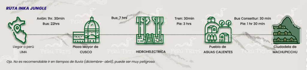 Como segunda ruta tenemos Inka Jungle que es un tanto peligrosa, pero es una opción más económica, para los que visitan Perú y quieren disfrutar de todo el paisaje con aventura. Para esta opción se va primero en un colectivo de la ciudad del cusco hasta hidroeléctrica” por 7 horas y desde este punto se realiza la caminata por las vías del tren que consta de 10km, 3 horas, o puedes tomar el tren hasta Aguas Calientes.