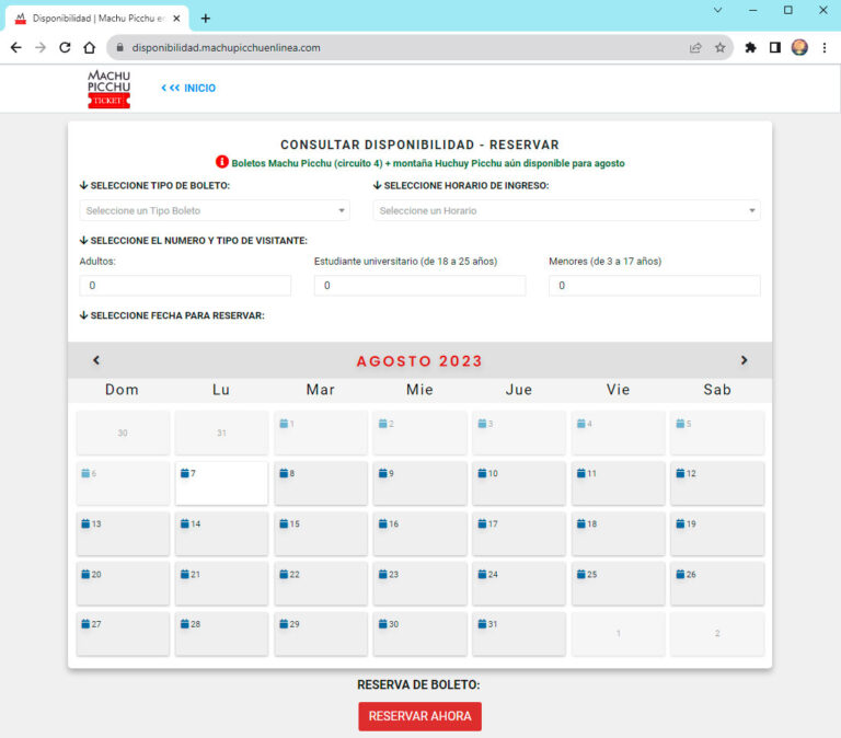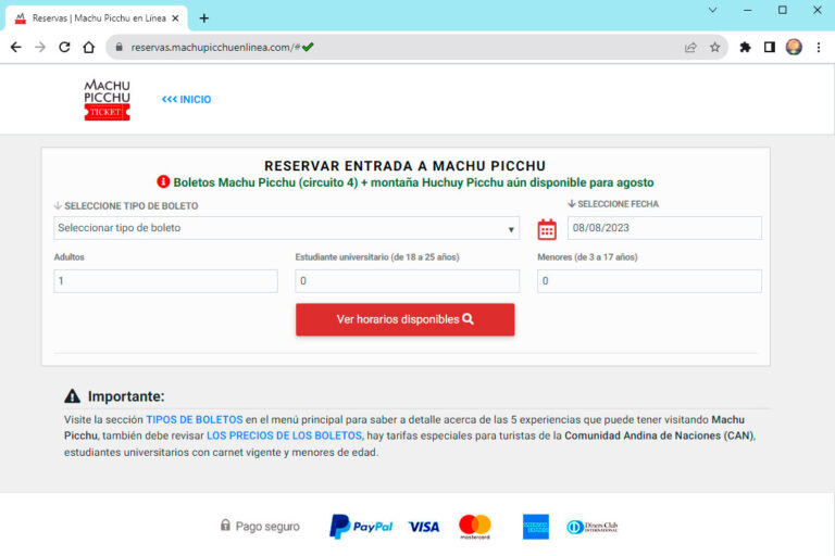 PASO 1: Revisar los TIPOS DE BOLETOS y PRECIOS en las secciones que aparecen en el menú principal, luego revise la disponibilidad haciendo clic en VER DISPONIBILIDAD ó en RESERVAR BOLETOS.