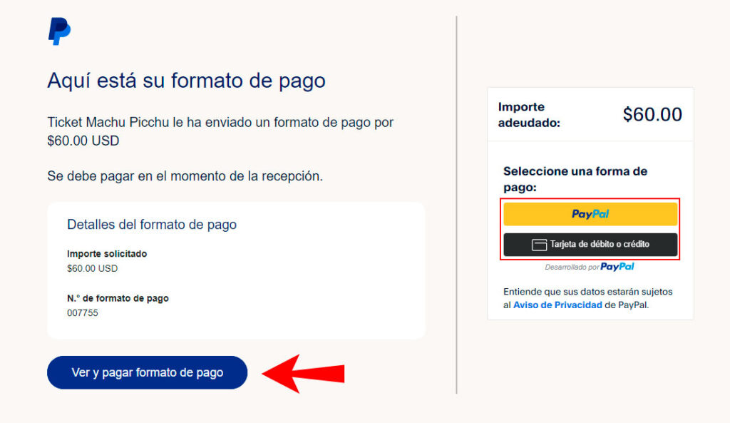 PASO 4: a los pocos minutos le llegará una solicitud de pago de PayPal a su correo, puede iniciar sesión y pagar con su cuenta o, en caso no tener cuenta, seleccione la opción "Pagar con tarjeta de débito o crédito" con este método no necesita ser usuario de PayPal.
