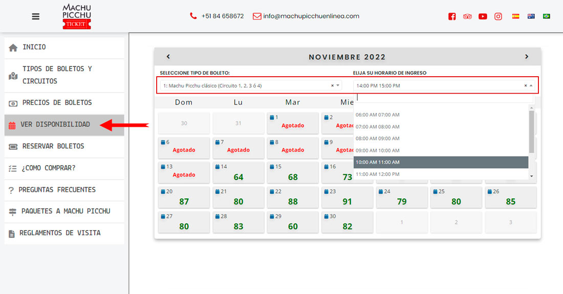 PASO 1: Verifique os TIPOS DE BILHETES e CUSTOS nas seções onde aparecem no menu principal, logo verificar a disposição de vagas clicando em VER DISPONIBILIDADE DE VAGAS ou RESERVAR BILHETES