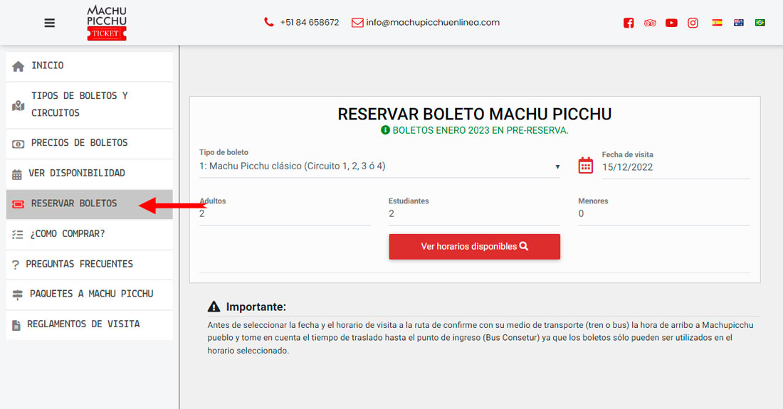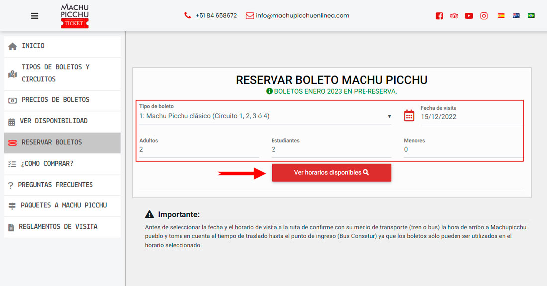 PASO 4: a continuação verá os horários disponíveis segundo os filtros da pesquisa, se deseja pode clicar em CONTINUAR CON A RESERVA caso contrário, se ainda não tem certeza sobre sua data de viagem então ingresse nova informação e consulte a disponibilidade vagas em outras datas.